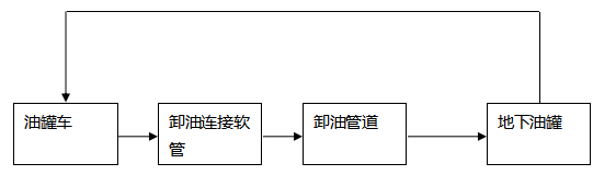 卸油工藝:油罐車行駛至加油站內密封卸油口停車處,利用油罐車與地下儲油罐的高位差,采用密閉式卸油。采用油氣回收系統,在油罐車卸油過程中,將原來儲油罐內散溢的油氣,通過油氣回收地下工藝管線及卸車軟管重新收集至油罐車內,實現卸油與油氣等體積置換。其工藝流程如下圖:
